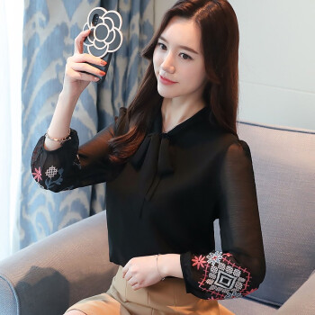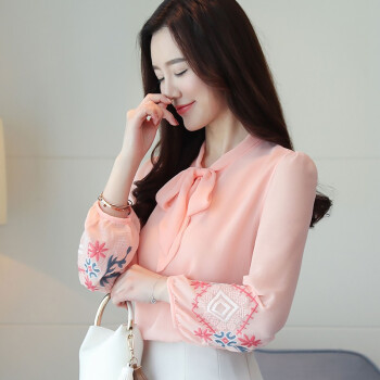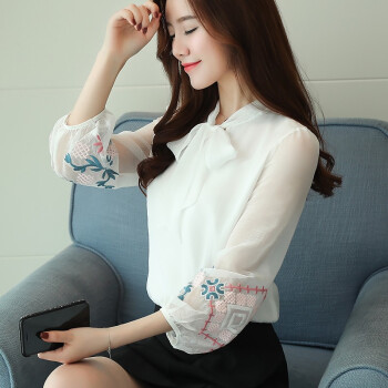 梵阕 雪纺衫女夏季新款女仙气长袖甜美刺绣打底衫蝴蝶结系带衬衫女秋装时尚女装上衣 白色 M |