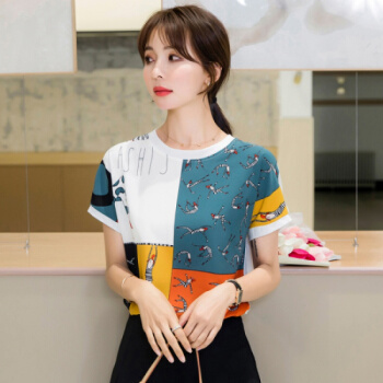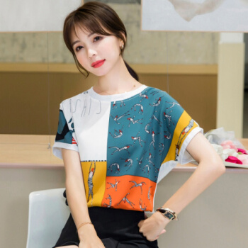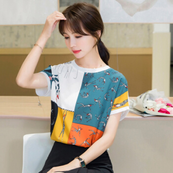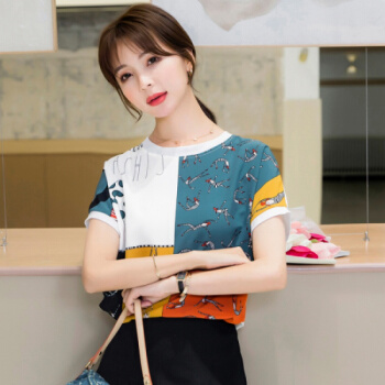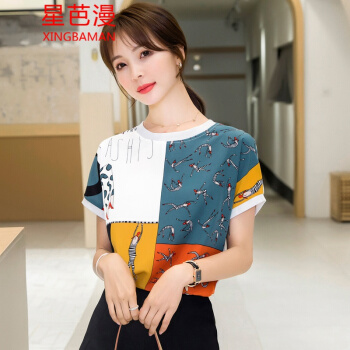 星芭漫 雪纺衫短袖女夏季新款上衣印花宽松薄款圆领拼接T恤衫#1049 花色 M |