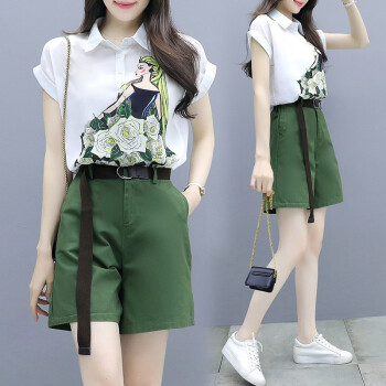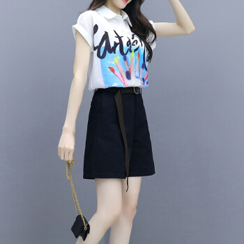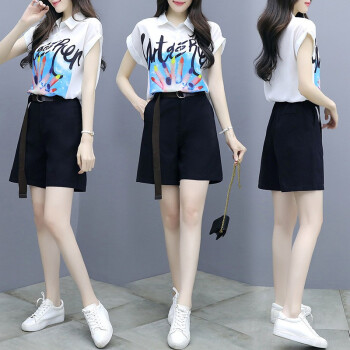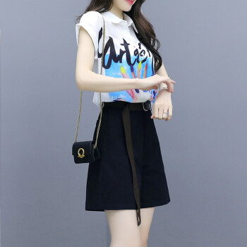 灏尼欧夏季新款洋气套装女时尚显示气质女装印花雪纺衬衫短裤两件套 黑色 L |