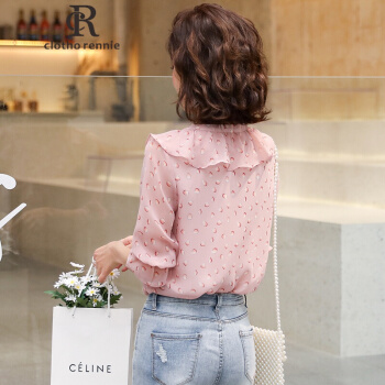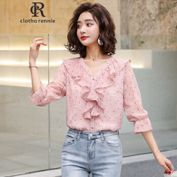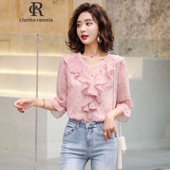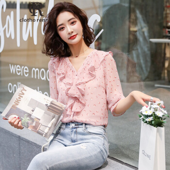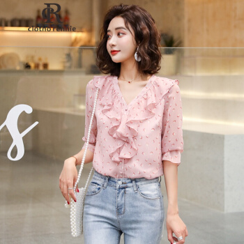 c1otho Rennie碎花雪纺衫短袖女夏季新款韩版宽松荷叶边V领上衣百搭仙气显瘦显气质 粉色 S |