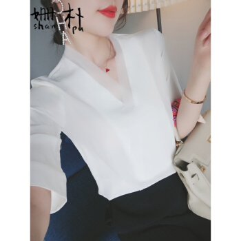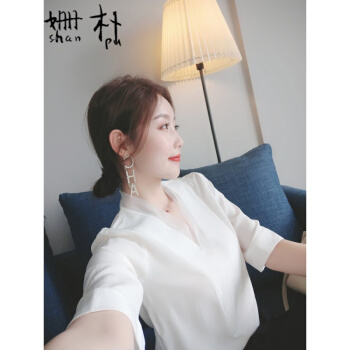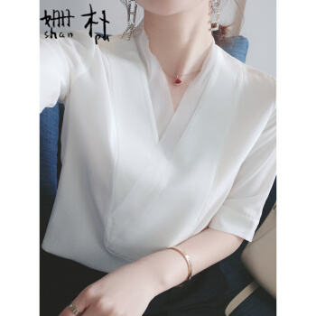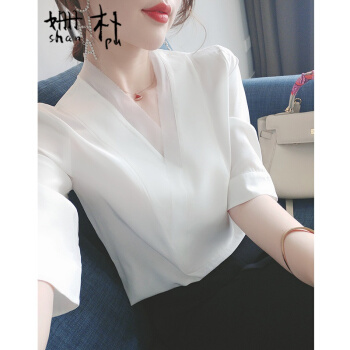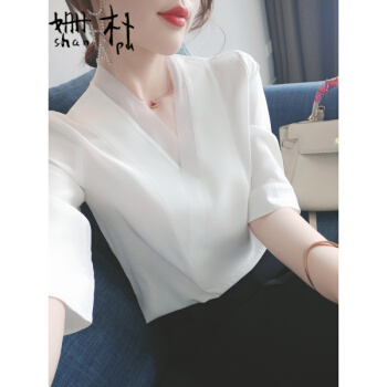 姗朴 雪纺衫女韩版夏季新款大码女装雪纺洋气上衣宽松显瘦气质小衫短袖休闲时尚仙气V领港味衬衫 白色 L |