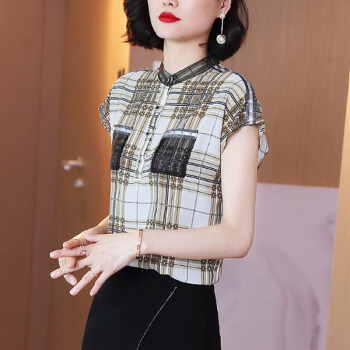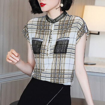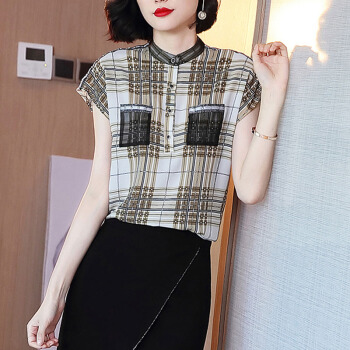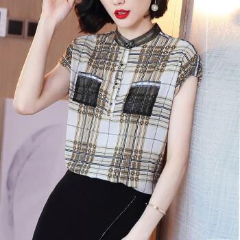 依语幽香复古格子雪纺印花衬衫女装夏季新款立领短袖上衣休闲宽松衬衣 图片色 L |
