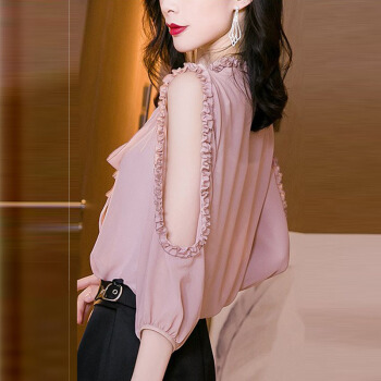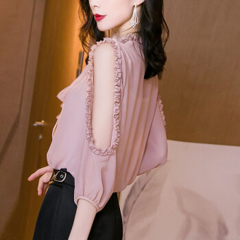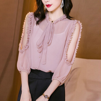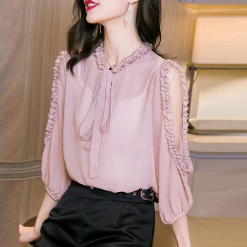 雪纺衬衫女装夏季新款韩版时尚系带洋气木耳边宽松百搭上衣设计感小众衬衣女 粉红色 L |