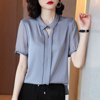 依语幽香休闲衬衫女装夏季新款短袖通勤衬衣百搭上衣缎面纯色 浅灰色 L |