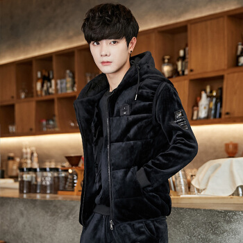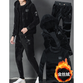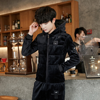 潮人卫衣男潮流衣服冬装情侣卫衣冬季金丝绒加绒加厚卫衣套装男韩版男生三件套男装 黑色 XL |