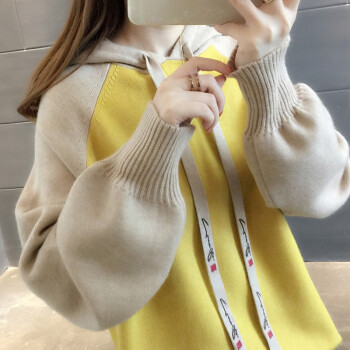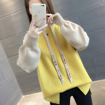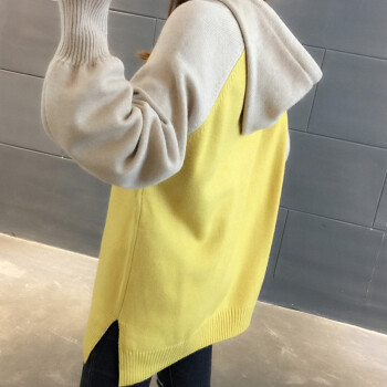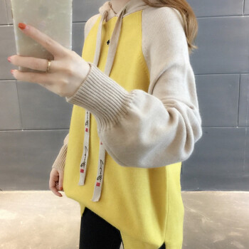 纤丝鸟 TINSINO 针织衫女秋冬新品拼色连帽针织毛衣女韩版宽松休闲上衣外套 黄色 请拍正确尺码 |