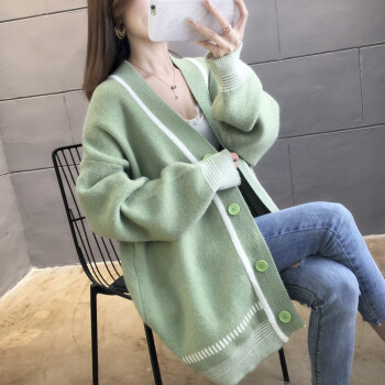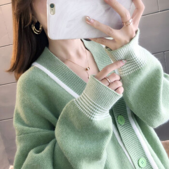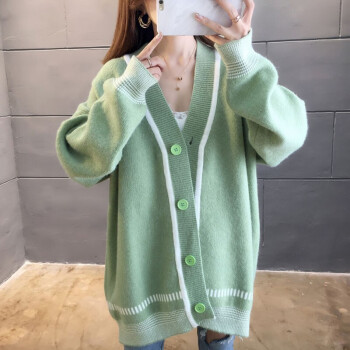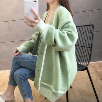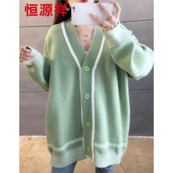 恒源祥针织衫女秋季新品韩版中长款开衫外套女针织衫潮宽松慵懒风时尚百搭V领上衣女111 绿色 M |