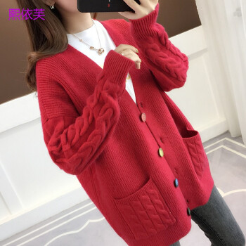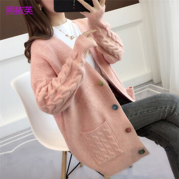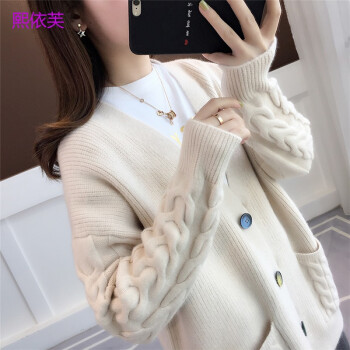 熙依芙针织衫女秋冬新款针织开衫女韩版宽松洋气外搭口袋麻花慵懒风毛衣外套 蓝色 M 刑释毛衣 |