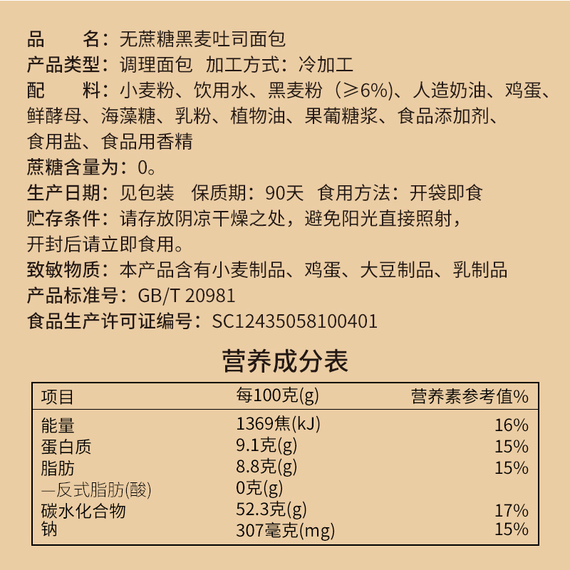 无蔗糖黑麦口袋吐司面包 |