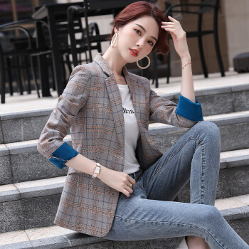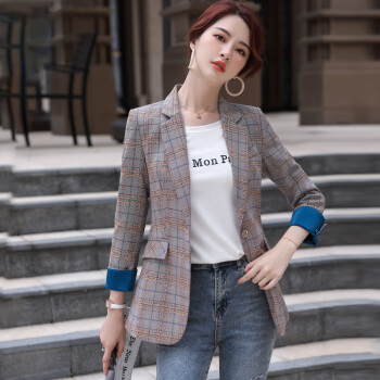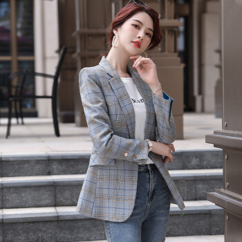 晨芙长袖格子小西装女外套时尚英伦风休闲复古学生百搭修身显瘦通勤上衣chic气质拼色小香风西服工作服 单件灰格西装 XL |