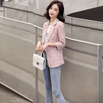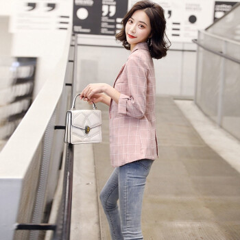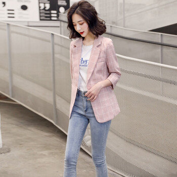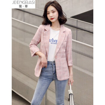 简草 小西装女秋季新款时尚韩版气质百搭修身休闲格子一粒扣单层小西服短外套女X8012 粉色 2XL |