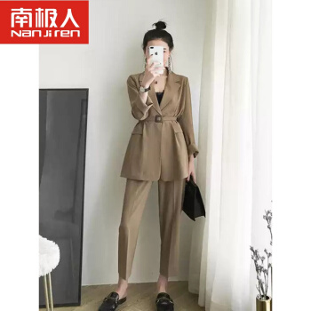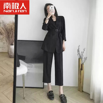南极人轻奢高端女装 chic网红小西装外套女韩版小香风赫本风女神气质职业西服两件套装 黑色套装(配腰带) S |