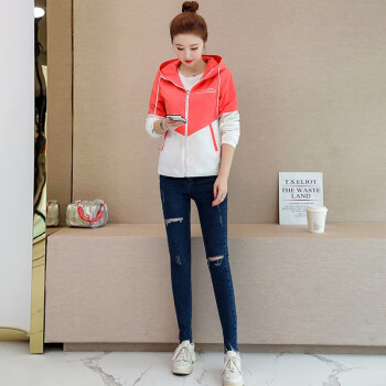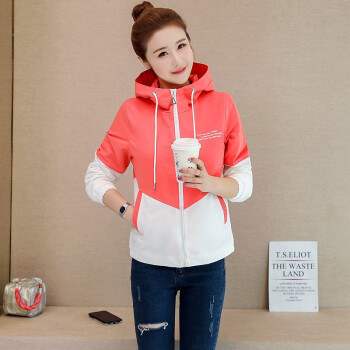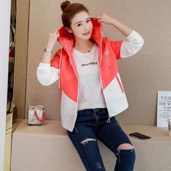 简草 短外套女秋季新款时尚潮流休闲百搭韩版气质拼色长袖连帽外套女D5812 桔色 L |