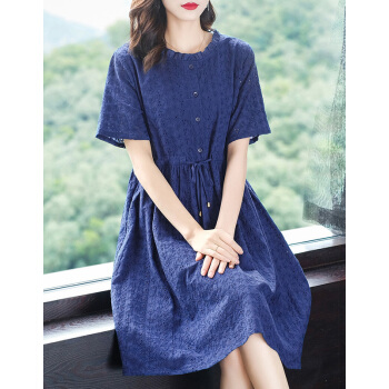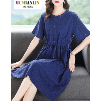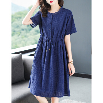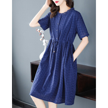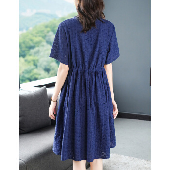 木棉林高端透气大码女装新款夏装胖妹妹mm洋气镂空中长款遮肚显瘦蕾丝连衣裙子H202563 宝蓝色 3XL建议160-180斤 |