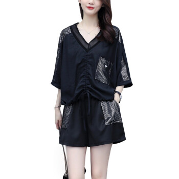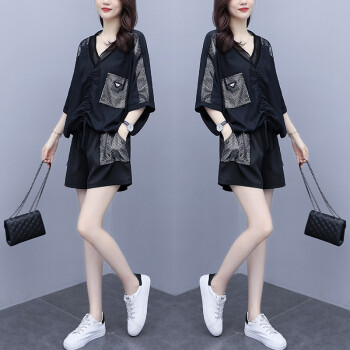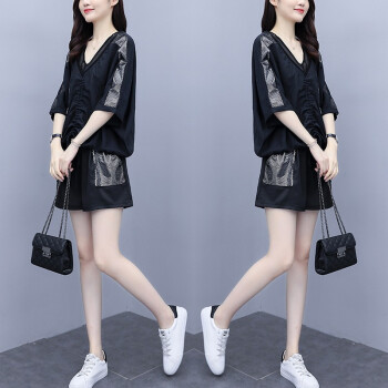 芷依丽 时尚大码胖MM套装女夏季新款宽松短袖上衣女T恤休闲阔腿短裤运动两件套 黑色 L |