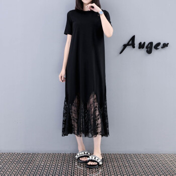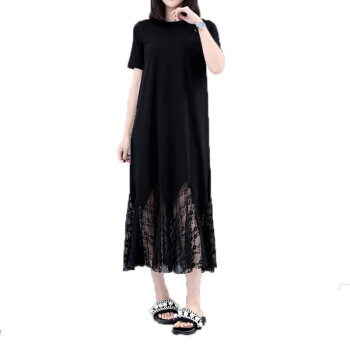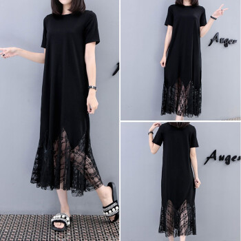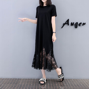 可馨怡 胖妹妹夏装新款蕾丝拼接大码女装胖mm中长款连衣裙宽松遮肚子显瘦鱼尾长裙女 黑色 XXXL(建议150-175斤左右) |