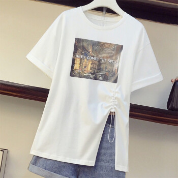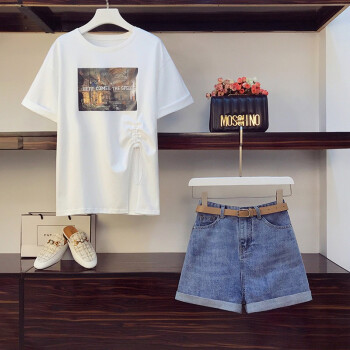 可馨怡 加肥加大码女装胖mm新款胖妹妹夏装200斤洋气遮肚子显瘦t恤牛仔短裤时尚两件套装 套装 XXXL(建议150-175斤左右) |