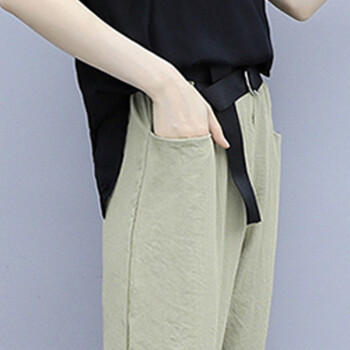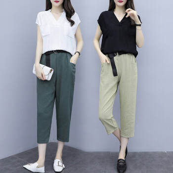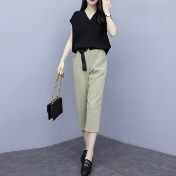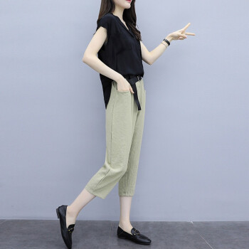 法萝迪 大码女装夏季新款棉麻女装遮肚子200斤胖妹妹加肥加大高腰阔腿裤套装 黑+卡 3XL |