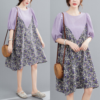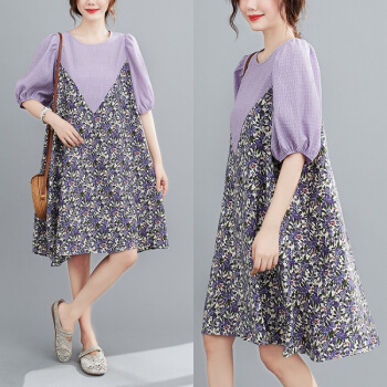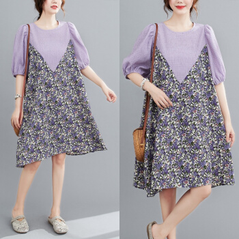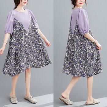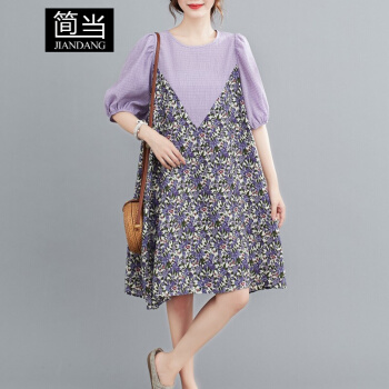 简当夏装新款加肥加大码女装胖妹妹MM碎花雪纺连衣裙法式裙宽松显瘦中长款A字裙SFF3456 紫碎花裙 均码( 100-190斤) |