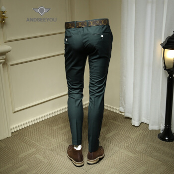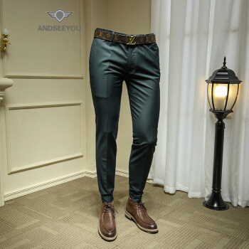 ANDSEEYOU 潮牌精品纯色西裤男 2019新款时尚帅气英伦风墨绿色商务正装小脚裤修身西装裤 绿色 (单件西裤)29码 |