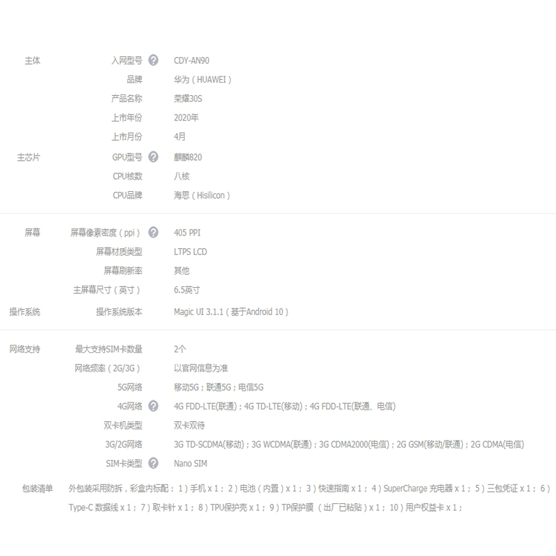 荣耀30S 双模5G 麒麟820 5G SOC芯片 8GB+128GB 蝶羽翠【其他/蝶羽翠】 |