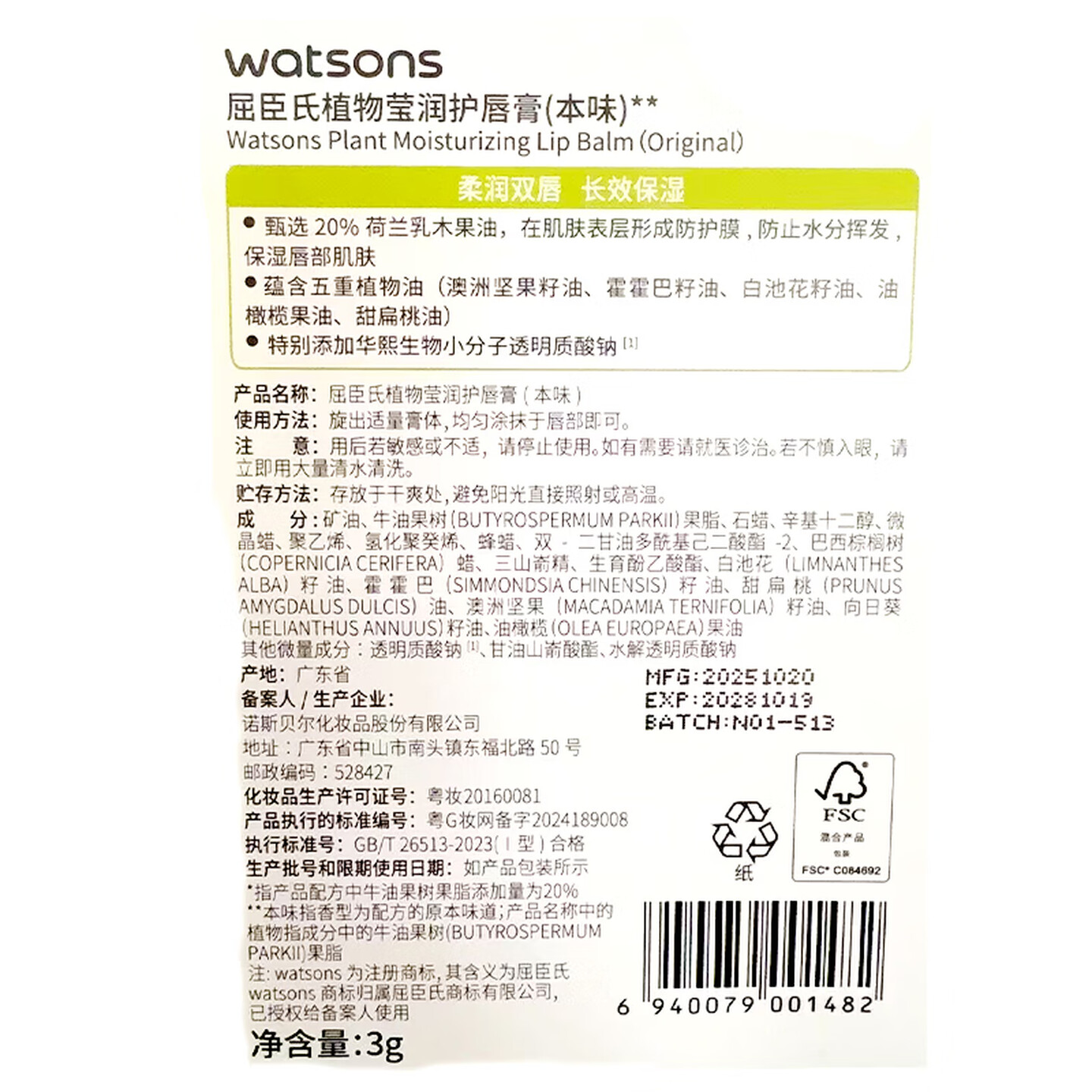 屈臣氏植物莹润护唇膏(无香型)3g |