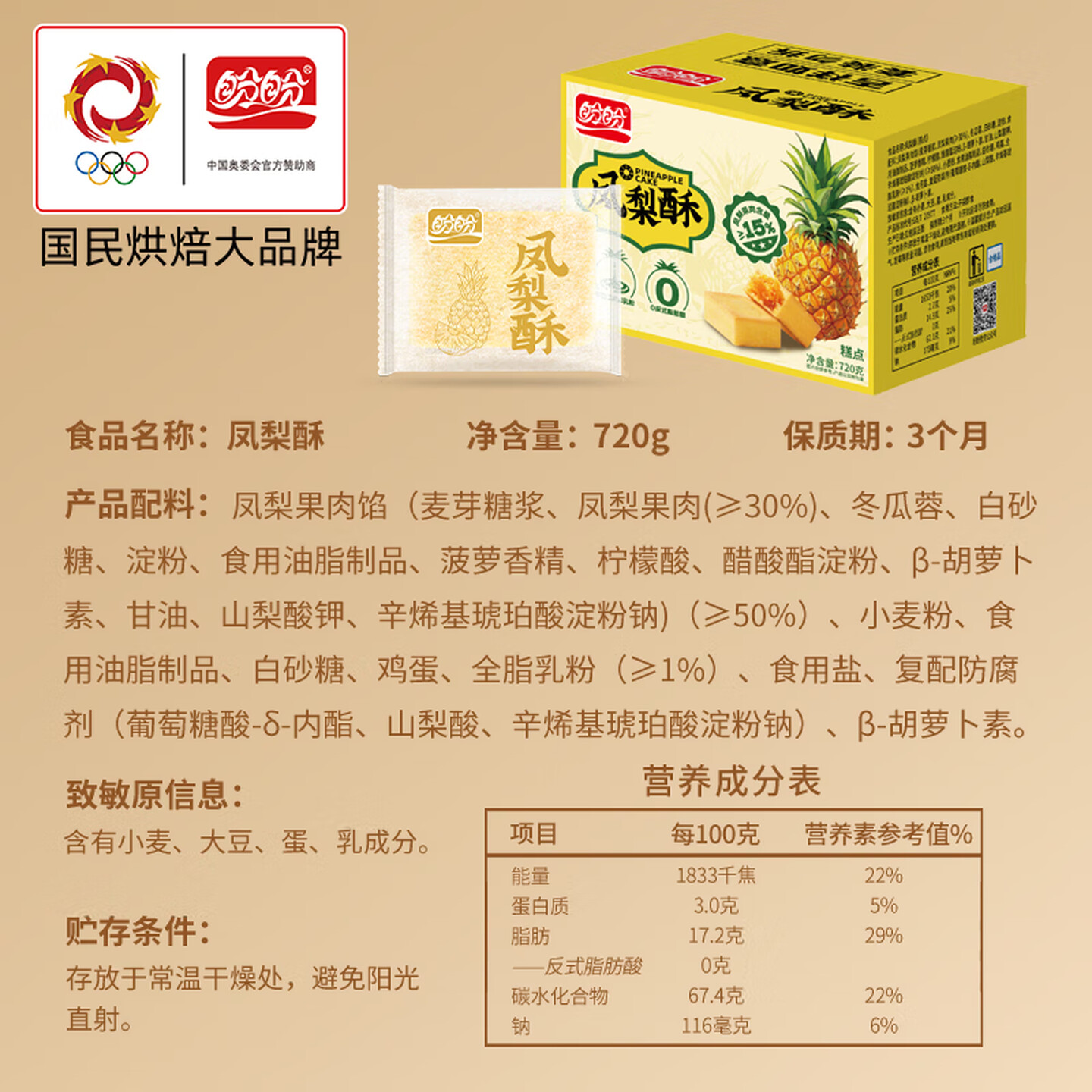 盼盼 凤梨酥 传统点心营养早餐休闲零食下午茶糕点 720g/盒 酥饼 |