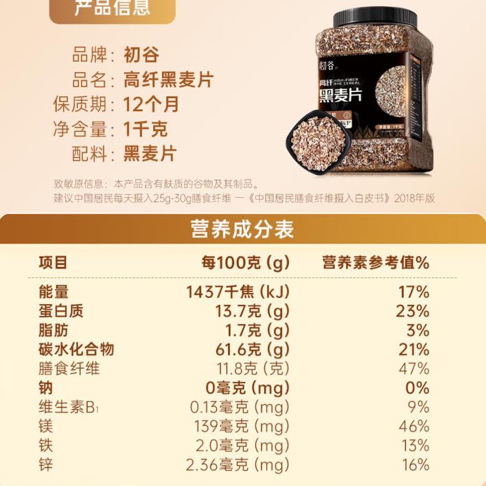 初谷高纤黑麦片1000g罐装 |